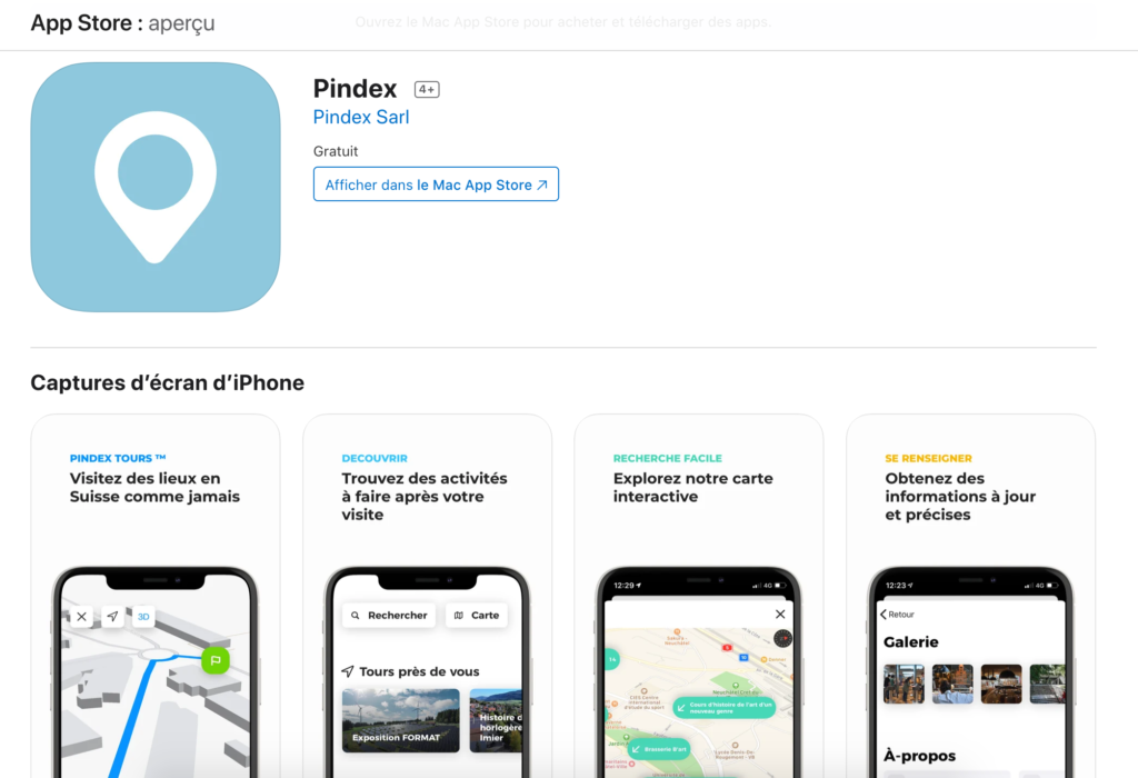 En parallèle, la start-up a développé Pindex Tours. Cette application pour smartphones permet de faire des visites guidées interactives. Sous forme de carte, elle permet au visiteur de suivre un tour. En fonction de sa géolocalisation, le visiteur verra apparaître des points d’intérêts définis par l’organisateur. En cliquant dessus, une vidéo, une anecdote historique, un commentaire audio, un texte ou des images pourront apparaître. L’application intègre également la réalité augmentée, intéressante si l’on veut donner la possibilité de voir un lieu autrement, par exemple en montrant l’état d’un site par le passé ou au contraire faire une projection dans le futur. L’application constitue donc un outil multimédia alléchant pour tous les offices de tourisme, mais aussi pour les institutions et événements culturels de grande ampleur.